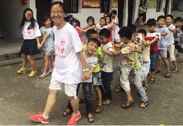 浙江大学三农协会学生和“小候鸟”们一起做游戏。