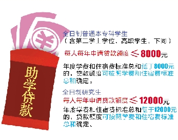全日制普通本专科学生(含第二学士学位、高职学生,下同)每人每年申请贷款额度不超过8000元;年度学费和住宿费标准总和低于8000元的,贷款额度可按照学费和住宿费标准总和确定。