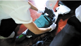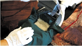 工作人员在除螨机集尘箱里垫了一层干净的布。