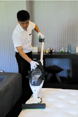 工作人员打开除螨机在床垫上来回吸了一遍。