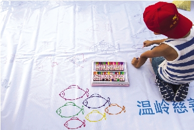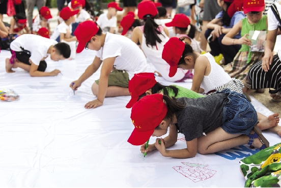 小义工们正在画布上以保护小鱼为题作画。本报记者 朱海伟摄
