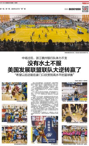 中场过后,场上风云突变。浙江稠州银行队队员体力有所下降,命中率降低,失误也开始增多,美国发展联盟联队见势加强了身体对抗,频频从浙江稠州银行队队员手中断球,再快攻篮下得分。第三节结束时,浙江稠州银行队只以66∶63的微弱优势,领先着场上比分。