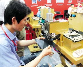 除了注塑机外,记者还注意到,一家广东企业展出的前帮机和中后帮机也很有意思。“以前在前帮、中后帮环节,大多是手工生产的,现在也可以由电脑控制了。”负责人张先生说,虽然使用自动化设备在产量上与以前相比有所降低,但在品质上提高了不少。而且他们推出的自动化设备能节省6个~8个人,不仅可以自动刷胶,还能像可视机器人一样,按照需求自动调节。