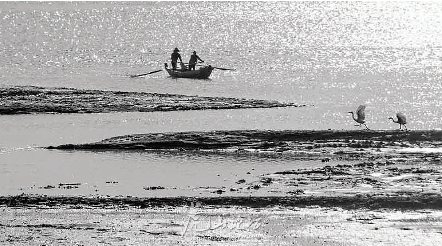 画面中,两位渔民摇着船桨,行驶在金灿灿的海面上。不远处,两只白鹭张开翅膀,在滩涂中追逐觅食。画面被处理成黑白,形式感更强。渔民和白鹭相互辉映,形成了一幅生动的劳动画。巧的是,两位渔民双手张开,和两只白鹭双翅撑开,画面如此的协调一致。能够抓住这一瞬间,除了运气之外,摄友“岁月如歌W”也费了好长时间等待。