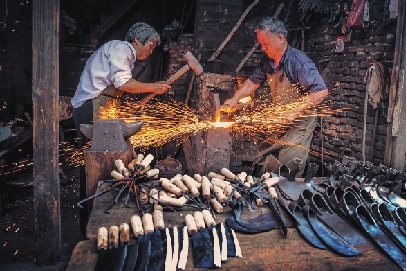 火花四溅的铁匠铺内,两位白发老人正在锤打着一把铁器,非常专注。门口摆着一排已经打好的铁器,似乎在炫耀着劳作的成果。曾经令人羡慕的打铁手艺,在渐渐没落,甚至到了消失的边缘。如何用镜头记录这门手艺,成了很多摄影爱好者热衷的话题。