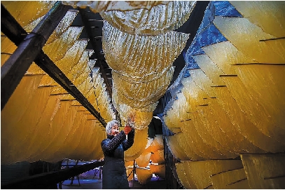 白水洋豆腐是临海特色小吃之一,其中豆腐皮的生产在当地也有上千年的历史。制作豆腐皮,需要磨浆、煮浆、分离、捞皮、挂晾、烘干……足足要耗4个多钟头。