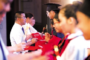 在毕业典礼上,学校还为五位优秀毕业生授予金博士荣誉称号。随后,初二、初一的优秀学生给获得二等奖学金和三等奖学金的学姐学长颁发奖状。“参加这样的颁奖典礼使我备受鼓舞,学姐学长今日获得的荣誉就是我努力的目标,希望明年我也能站在这里领奖。”一名参加颁奖的同学说。