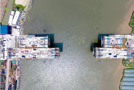 近日,沿海高速金清港大桥正在有序施工,起自南北两岸的桥面缓缓向大港中心延伸。目前,该大桥已完成工程进度为65%。按照计划,大桥左幅将于9月份合龙,右幅将于11月底合龙。