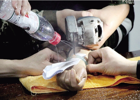 准备好器材后,一名消防员迅速将女子的右手托住,在确定骨折部位后,将手镯移到离骨折部位最远处,另一名消防员将小铁片慢慢地塞进手腕与手镯之间。随后,一名经验丰富的老班长用砂轮切割机小心翼翼地切割手镯,旁边一名官兵浇水降温。经过努力,玉镯被成功切断。