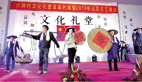 1月1日,在新河镇六闸村的“村晚”上,十多名戴着箬帽、系着围巾的农民,带着竹篮、锄头、耙等表演农具展,让观众在舞蹈的行进间重温了一把“锄草、浇水、插秧、收割、晒稻”等农事情结,既乐了乡亲,又浓了乡情。