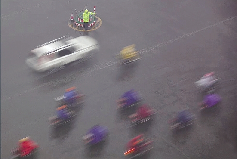前几日的雨天,想必大家是再也不想遇见了。南方冬天的湿冷,在那几天让多少坚强的汉子穿上了秋裤,躲在家中还瑟瑟发抖。然而,有这么一批人,还在室外坚守他们的岗位,他们就是交警。 照片中,穿戴防雨设备的交警,在道路中间指挥着交通。行色匆匆的路人,穿着雨衣快速通过。一虚一实,一静一动,让处在画面边缘的主体突出,同时也让照片的主题凸显。画面中,白色轿车色彩过于明亮,可以适当暗化。 本报签约摄影师 周学军摄 |