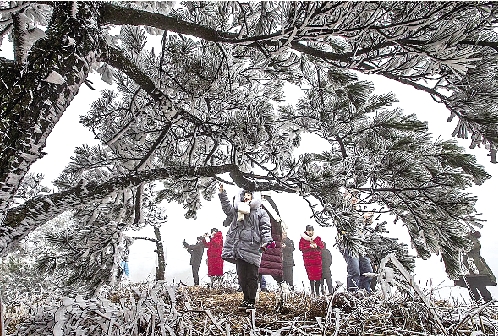 近几天的天气有很多槽点。但是对于雾凇、雪天,我们却是欣喜向往的。1月6日,在天台县石梁镇华顶景区,气温降至零度以下,山顶的树枝缀满冰挂,出现非常漂亮的雾凇美景,吸引了众多市民前往游玩。 这张照片采用广角拍摄,将雾凇满树的场景直观地呈现。树后的游客或自拍,或欣喜……通过他们的情绪将画面不断拓展。除了靠近镜头的孩子,两位穿红衣服的游客也是一大亮点。在抓拍瞬间,如何取舍颜色,也是一大考虑元素。鲜艳的红色,在大面积的白色雾凇里面特别明显,使整个画面不至于失去焦点。 拍友 孙金标摄 |