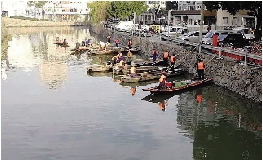 1月13日,泽国镇南官河和联树桥河交界处,13条保洁船“整装待发”。泽国镇每天都会组织保洁船清理辖区内的河道,巩固“五水共治”成果。