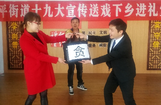 年关将近,以送礼名义行贿的也多了起来。日前,太平街道纪工委专门编排了一期廉政文艺节目,利用文化礼堂这个舞台进行巡回演出,警示人们一定要把好廉政关,不该拿的东西不要拿,不该收的礼千万不要收。图为演员正在表演小品《要客来访》。