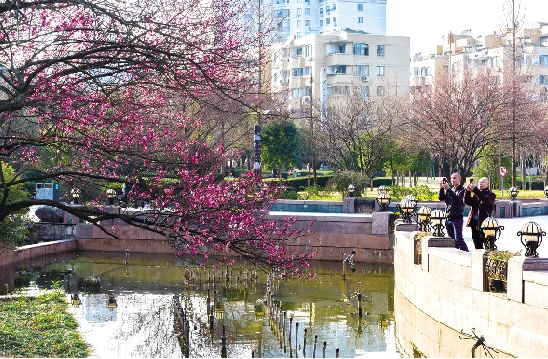 1月22日下午,两位市民正在市区东辉公园拍摄盛开的梅花。现在正值梅花季节,东辉公园的梅花正陆续开放,市民可趁着晴好天气,前往观赏。