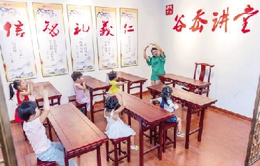 | 彭家村文化礼堂内,孩子们在谷岙讲堂学《弟子规》。本报记者 朱海伟摄 |