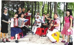 除了老江家里,他们也会去石夫人峰脚下、锦屏公园等地开一场野外音乐会。在老人们看来,听流水潺潺,看绿叶葱茏,呼吸着新鲜空气,在大自然中享受艺术的感觉也很过瘾。“我们就爱各种折腾,元旦,群里组织去花芯水库野炊,煮了猪肉饭。每个人还把乐器和演出道具都带上了,这是一场优雅浪漫的音乐会,赞极了。”张阿姨说。