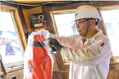 验船师核验救生衣的浮力是否达到150牛的指数。本报记者 徐伟杰摄