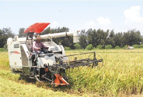 7月28日上午,国家级农业综合开发项目——松门镇南洋中低产田改造项目区,数十台收割机穿梭于稻浪中。