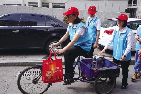 “蹬三轮车不比开车简单,车头轻、车身重,一下就蹬歪了。”客户经理吴丹萍笑着说,“起初我信心满满地上车,可这车子就是不受控制,总是不自觉地往墙上撞。为了不把准备送出去的点心掀翻,经常是一人骑车,身后再配备两个‘保镖’。”