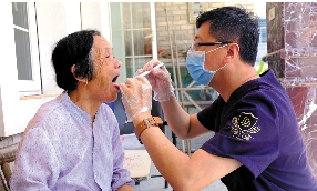 在城南镇沙头门村,医护人员为孔小和阿公进行口腔和视力检查,发现其眼部问题较多,建议其尽快到医院治疗。孔小和现年80岁,1958年入伍,目前身体状况不太好,因无亲属照顾,独居于一间老屋。当医护人员准备离开时,一直非常开心的孔小和默默地流下了泪水,“谢谢你们来看我,我很感动!”