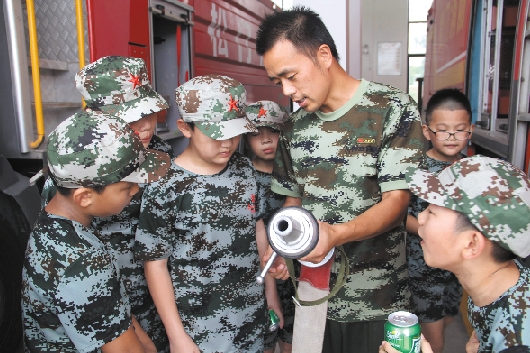 | 在快乐中学知识 8月3日上午,在松门镇专职消防队里,消防官兵正在给“小候鸟”们讲解消防车上的救援设备。 当天,“快乐家文化”第五期夏令营开幕。这一期夏令营共有40名“小候鸟”,分两批次进行,分别是6~10岁一批,10~13岁一批。每期夏令营的时间是三天两夜,活动地点放在市素质教育实践基地,安排的活动项目有“我是小小交通指挥员”“防台抗台知识普及”“军体拳体验学习”“我是小小超市员”等,让孩子们在快乐中学到知识。 本报签约摄影师 江文辉摄 |
