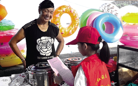 8月4日下午,在城南镇吉捕岙沙滩,锦园小学二(2)班的学生向摊贩和游客分发环保倡议书。该班级将暑假实践和环境保护相结合,到观岙污水处理厂参观污水处理过程、到吉捕岙沙滩捡拾垃圾,并宣传垃圾分类、“五水共治”等内容。 本报记者 赵云摄