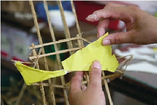 梁财庆正在竹架上糊上彩纸。