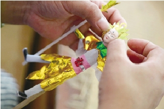 梁财庆为纸人粘上头盔。