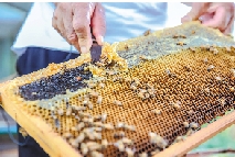 | 李加夫正在用刮刀拨开蜂蜡,给记者展示蜂巢中的蜂蜜。 |
