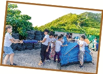 沿着蜿蜒的小道,营员们行车来到了金阿顶。从山腰上往下眺望,美丽的海景便映入眼帘。欣赏完海景后,营员们开始了夏令营的第一项活动——“不倒森林”。在放掉自己手上棒子的同时,营员们需要同时抓住队员的棒子。看似简单的操作,难倒了不少人。经过几次尝试,他们终于成功了。接着,营员们玩起了“真情传递”。看,乒乓球顺着他们手上的管子滚下,第一个营员需要拿着管子飞快地跑到最后一个位置,反复移动直到乒乓球落入最后的瓶子中。“真难啊!”来自锦园小学的江司齐说,“没有默契的话,很难完成!”虽然最后没有成功,但大伙还是玩得非常开心。