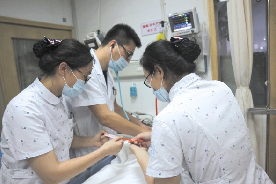 抢救室内,急诊科副主任医师陈培俊给患者检查,再次评估患者病情。