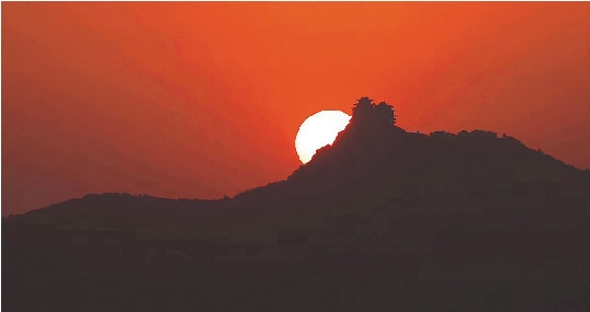 | 白日依山尽 楼旗尖,阅尽蓝天白云、滂沱暴雨、朝阳晚霞。然而,这张楼旗尖,与平常看到的照片有点不同。拍摄者运用黑色和红色的经典搭配,并利用剪影的效果,将日落时的楼旗尖衬托得非常大气。 拍摄者再饶有趣味地配上唐朝诗人王之涣的经典绝句“白日依山尽”作为题目,借古喻今,仿佛是一种穿越时空的交流,带我们共同领略祖国的大好河山。如果落日能再高一点,让楼旗尖完全映照在落日之下,这张照片将会更美。 本报签约摄影师 周学军摄 |