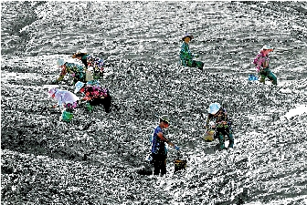 大多数和滩涂有关的作品,都会跟日出日落、朝阳晚霞搭配,用色彩勾勒出美丽的劳动场景。而赵洪亮这张照片,以高低起伏的滩涂作为背景,在滩涂上劳作的女人点缀其间,使画面简洁的同时,也令劳作的场景更加凸显。