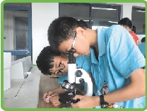 | 营员们用显微镜观察植物根茎。 |
