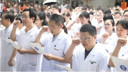 签名活动结束后,在院长徐道绲的带领下,全院临床、医技科室的200多名医师举起右拳庄严宣誓:“自觉维护医学的尊严和神圣,敬佑生命,平等仁爱,患者至上,真诚守信……”