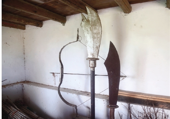 左边墙上,贴有《惟桧榜名师桧家史简介》,右边墙边立着一柄长刀、一把砍刀、一把弓,不知是否武进士当年遗留下来的。两边都堆着不少杂物,左边地上是一袋袋的谷壳。