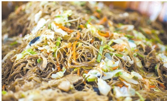 主菜必须是绿豆面无疑了。石塘人炒的绿豆面,只要端上来,便是色香味俱全的最佳范本。绿色的面条软糯却又筋道,各种配菜颜色搭配得美观。这也和石塘人的饮食习惯有关,石塘人煮一碗三鲜面,有半碗是浇头,炒面也不例外。绿豆面要想好吃,各种配菜必不可少。炒的时候,配菜和面条在锅里要一直翻抖,这样面条才不会黏在一起。因此,炒好一盆绿豆面,是颇要一身功夫的。