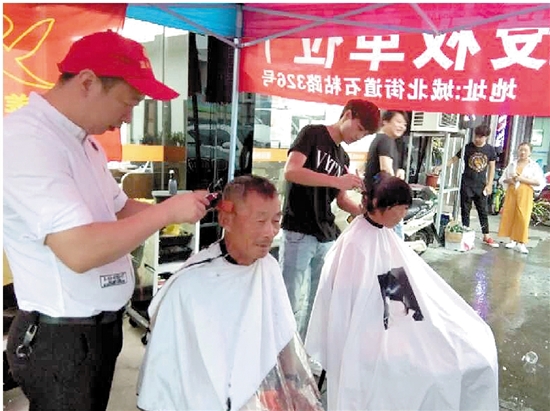 当天,志愿者们还免费给环卫工人理发,现场气氛和谐活跃。