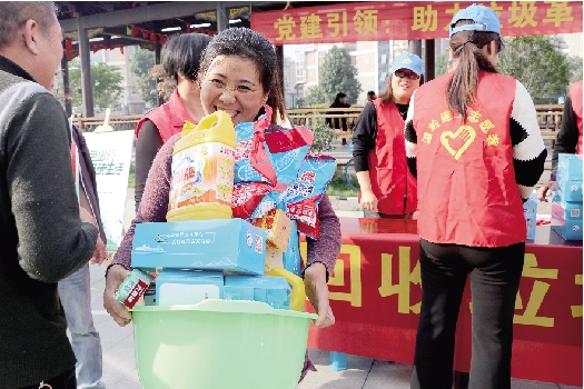在岩下社区岩下文化长廊活动现场,悬挂横幅的摊点十分显眼,桌上整齐摆放着洗洁精、餐巾纸、水杯、肥皂等日常生活用品。活动还没开始,现场就早早地围满了前来参加活动的居民,大伙手上拿着分类好的空饮料瓶、塑料油壶、废旧电池、废纸箱等可回收垃圾,一起交给现场工作人员兑换积分,再根据积分兑换不同礼品。“1只空饮料瓶兑换1积分,1个塑料油壶兑换2积分,1斤废纸箱兑换10积分……”“洗洁精40分,餐巾纸20分,水杯20分……”居民们兑换礼品后,有说有笑地离开,并相互交流着垃圾分类的心得。对于社区开展可回收垃圾兑换礼品活动,居民们表示举双手赞成,既能支持环保,又能兑换一些日常生活用品。