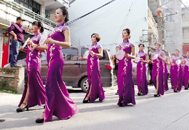 这支村妇旗袍秀队伍是当天临时成立的,原有127位妇女参与,但因服装和临场怯阵等原因,最后只有60多名妇女参加走秀。 本报通讯员 金云国摄