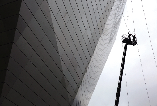 温岭博物馆工程已竣工。日前,工人正在全面清洗外墙,以迎接开馆日的到来。