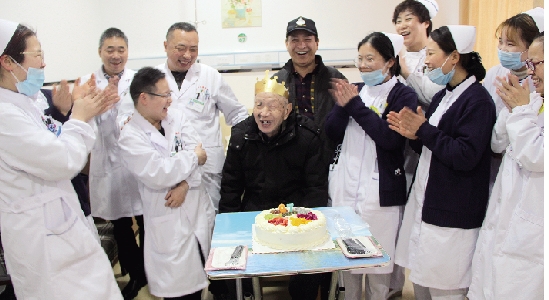 “我们想给阿公一个惊喜。”得知老人的农历生日后,大伙儿商量,想为老人办一个简单温馨的生日会。当三病区主任张洪波带领科室全体医护人员,手捧蛋糕、鲜花出现在老人面前时,老人对这意外的祝福感到无比惊讶和激动。“祝您福如东海,寿比南山。”大家祝福老人开心、健康,还相约共庆百岁生日。