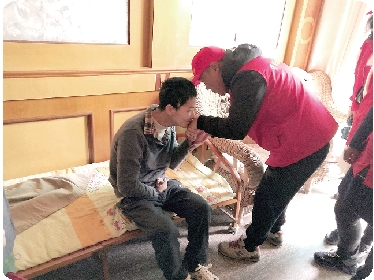 这张照片是吉祥石塘志愿者去小平家探望,临行告别前所拍的一幕。石塘镇17岁的少年小平身世凄苦,数年前发生意外事故后生活不能自理。母亲、爷爷相继病故,奶奶患癌。父亲为了生计只好去海上讨生活,平日雇人照顾孩子。吉祥石塘志愿队组织队员们每个月去看望他几次,给孩子带去家用电器和生活用品,同孩子聊天话家常。小平和志愿者们结下了深厚的感情,志愿者们临走时,他向叔叔阿姨们表达谢意,轻轻地吻在志愿者叔叔的手背上。这个场景不禁让现场的每个人动容。