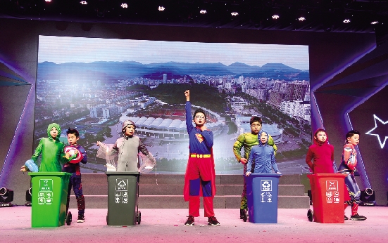 2018年12月30日晚,“成长如歌——童心接力中国梦”语言专场在市青少年宫举行。当晚,市青少年宫GO艺术文化艺术工作室、星动小主播、家燕妈妈艺术中心、温岭中学、市三中、市二中、太平高级职业中学、市朗诵协会等单位、社团选送了情景朗诵、脱口秀、情景剧、哑剧等14个节目。图为城东小学选送的情景剧《让垃圾回家》。