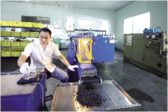 2017年,赵玲方又尝试着购入了几台注射机,只要把材料制成条状,设备就能自动把橡胶吸进去,熔化掉再注射到模具里。“比起以往的设备,注射机不仅能节省下片、切片等多道工序,而且能提高产品合格率和延长模具的使用寿命。”他说,以前的设备是靠模压的,导致模具容易磨损,加工到5000模左右可能就需要更换,但现在加工到两三万模都没什么问题。而且出模速度更快了,每一模可以节省1~2分钟。这样一来,设备利用率提高了,生产能力也提高了,就连产品的合格率也从原来的80%多提高到了如今的95%以上,甚至能达到99%。