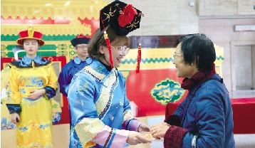1月7日下午3时,工作人员换上了传统戏服,在营业厅内上演了一出“宫廷穿越”。工作人员风趣幽默的主持词逗得现场的市民哈哈大笑,气氛一下子热闹了起来。“娘娘”们徐徐走来,向市民送上了节日小礼品和吉祥祝福语。