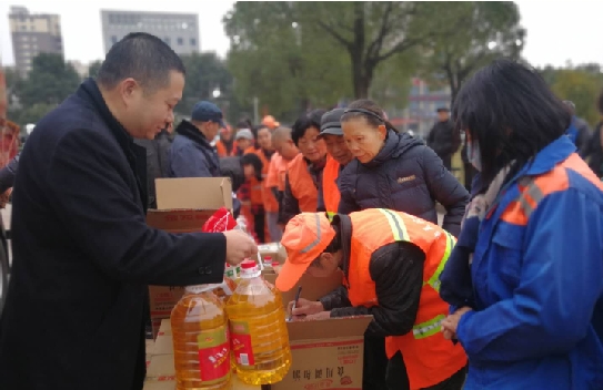 本报讯(记者朱飘安旗/文 通讯员卓莹/图)近日,在泽国镇市民广场,市道教协会给66位环卫工人送上了油和大米。