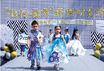 5月30日,市长天幼儿园的小朋友们穿着用旧报纸、纸箱、塑料袋等制作的各类环保时装,用一场别出心裁的走秀迎接“六一”儿童节的到来。