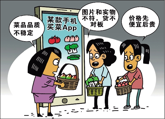 手机买菜看上去方便快捷,但记者在采访中听到的吐槽也不少:菜品品质不稳定;图片和实物不符,货不对板;价格先便宜后贵等。
